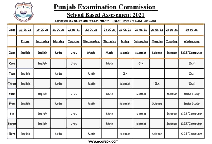 Punjab Education Commission (PEC) in their notification Dated: 02-06-2021 notified the schedule & SOPs for conducting School Based Assessment (SBA) exam from Grade I to VIII.  According to the schedule SBA exams will be conducted according to following;